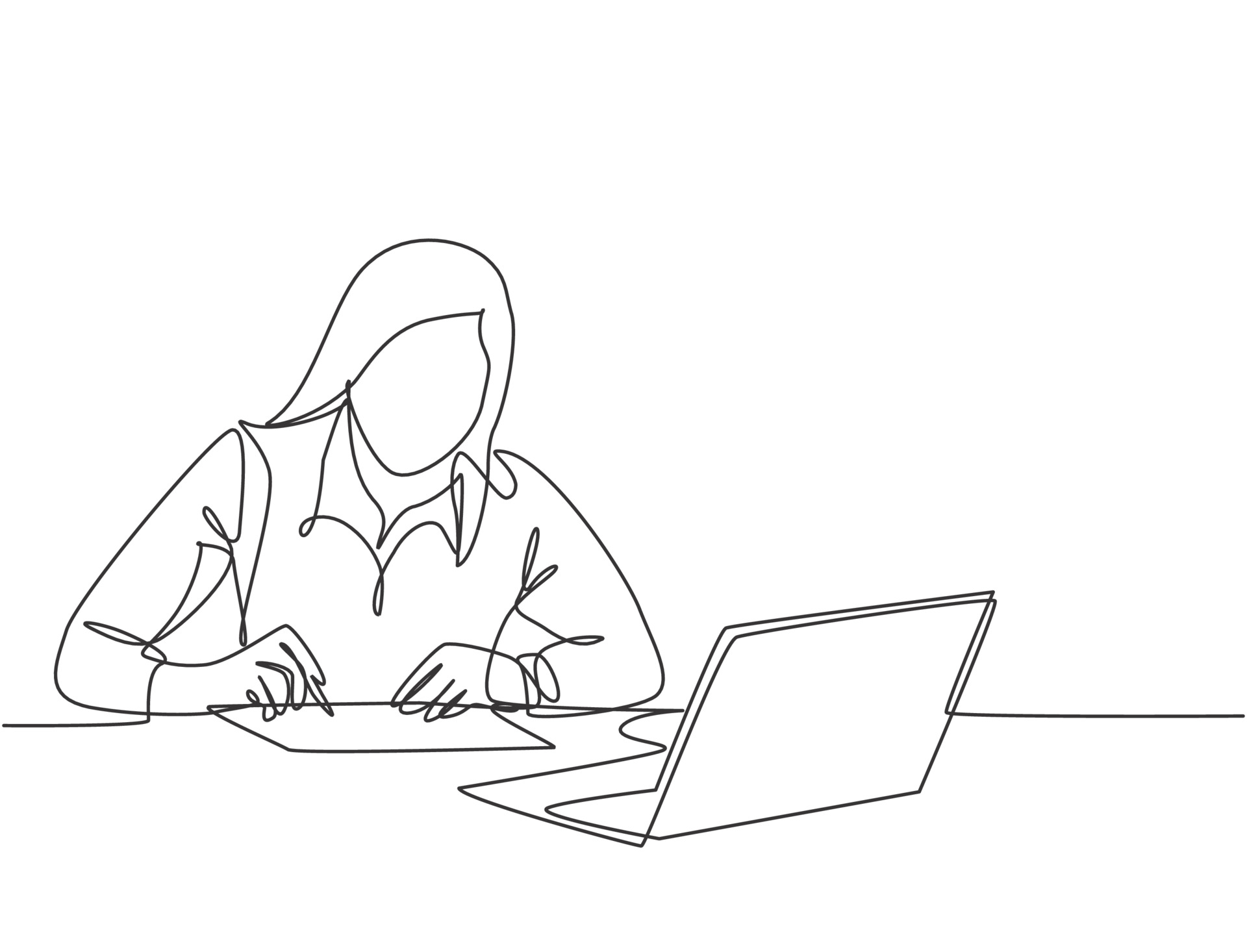 One Continuous Line Drawing Of Young Serious Female Worker Sitting Pensively While Watching Laptop Screen At Work Desk Business Analyze Concept Single Line Draw Graphic Design Vector Illustration 3592771 Vector Art At