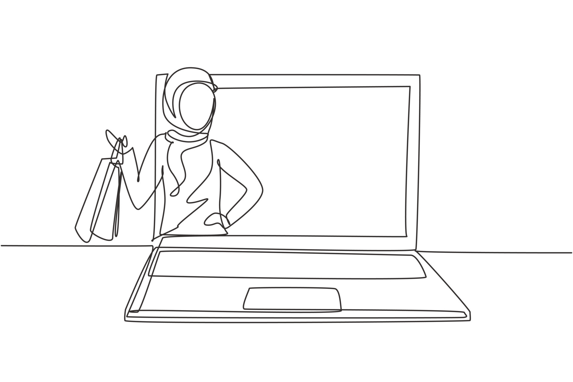 Single One Line Drawing Young Arabian Woman Coming Out Of Laptop Screen Holding Shopping Bags Digital Lifestyle And Consumerism Concept Modern Continuous Line Draw Design Graphic Vector Illustration 4482617 Vector Art At